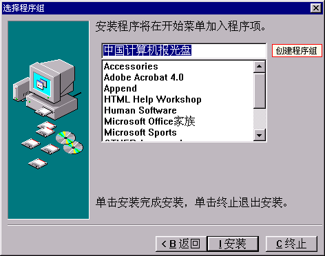 | 20、一些特殊软件的安装(一) 接下来我再给大家街上一些特殊的软件安装,有时我们买了一张多媒体的光盘,比如这张INFO CD的光盘,只要将它放到光驱中,它上面的程序就自动的启动了。 像这类的软件就不用我们自己去找安装程序了,因为它的安装程序已经自动运行了,只需要按照画面上的提示操作即可。 比如这里就用鼠标点一下这个“安装”即可,出现一个是否安装的提示窗,点“是”继续。 现在是提示安装后将在开始菜单的程序项中创建一个新的程序组,名字已经取好了,点“安装”。 已经开始复制文件了。最后只要再点一下“完成”就行了。我们来看一下开始菜单,这就是刚建立的新程序组。