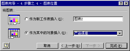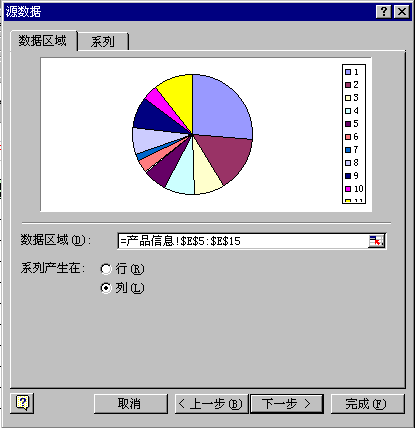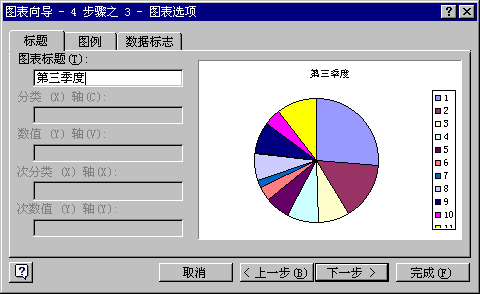 | | | 建立图表 | | 图表在数据统计中用途很大。我们拿一个例子来讲吧:这是一个市场调查表,显示了几种品牌的饮料在各个季度的销量百分比。 我们来做一个表示第二季度的几种商品所占比例的饼图,打开“插入”菜单,单击“图表”命令,打开“图表向导”对话框,第一步是选择图表的类型,我们从左边的“类型”列表中选择“饼图”,从右边的“子图表类型”列表中选择默认的第一个,单击“下一步”按钮。 | | 出现步骤2的对话框,这个对话框中要为饼图选择一个数据区域:单击“数据区域”输入框中的拾取按钮 ,对话框缩成了一个横条,选中“二季度”下面的这些数值,然后单击“图表向导”对话框中的返回按钮,回到原来的“图表向导”对话框,从预览框中可以看到我们设置的饼图就已经有了一个大概的样子了,单击“下一步”按钮。 |  | | 现在要设置图表的各项标题,因为饼图没有X、Y轴,所以只能设置它的标题,设置它的标题为“二季度”,单击“下一步”按钮。 |  | | 这一步是选择生成的图表放置的位置,选择“作为其中的对象插入”,单击“完成”按钮;饼图就完成了。 | |  | | 这样一张图表就做好了。 |  |