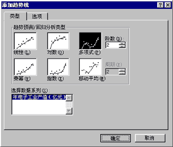 在数据系列上单击鼠标右键,从快捷菜单中选择“添加趋势线”。在对话窗中可以看到Excel提供了四种回归分析的类型,这些类型需要依据应用来自己选择。 这里我们选择“多项式”,阶数选择默认值“2”,然后单击“确定”。