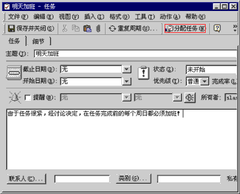 在任务列表中单击“主题”列标下面的“单击此处添加新任务”,在光标处输入任务的主题内容,按回车键后,该任务就会被添加到任务列表。 双击此任务,在弹出的窗口中可以输入更详细的内容。单击“分配任务”按钮,再单击“收件人”按钮,  在“选择任务收件人”对话框中,从左侧列表 中选择一个收件人,双击,然后单击“确定”按钮,  单击“发送”按钮,这项任务就被分配出去了。  这时在任务列表中此项任务左侧就出现了“已分派给他人任务”的图标,如果双击此图标,就会出现一个对话框,这时我们不能再编辑这项任务,只能等待接受任务者的回信。 |