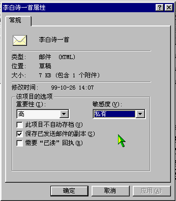 邮件的优先级和敏感度也可以在Outlook中进行设置。在Outlook中,“收件箱”文件夹里的项目,其优先级用一系列的符号来表示。红色的惊叹号表示邮件很重要,图标前面有一个向下箭头标志的邮件表示不怎么重要,而什么标志都没有的邮件表示普通信件了。对信件的重要性的设置也不难。在邮件编辑窗口的“常用”工具栏上有红色惊叹号和向下箭头按钮,它们分别叫“重要性:高”和“重要性:低”,单击它们就可以设置邮件的重要性了。现在我们单击“重要性:高”按钮,按钮被按下去了。 邮件的重要性也可以修改。我们再次单击“重要性:高”按钮,按钮弹起来了,这时邮件就是普通邮件了。现在我们单击“文件”菜单,选择“属性”命令,弹出了“属性”对话框,在这里我们也可以通过对"重要性"下拉列表的选择来设定邮件的优先级。 前面讲了邮件的优先级,下面我们来看一看邮件的敏感度。我们打开“敏感度”下拉列表。在这里可以选择邮件的敏感度级别,如果选择“私有”,就可以防止邮件发出去之后再被别人修改。这样做就使得发送重要邮件的安全性提高了。