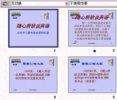 幻灯片的切换效果就是在幻灯片的放映过程中,放完成这一页后,这一页怎么消失,下一页怎么出来。这样做可以增加幻灯片放映的活泼性和生动性,那么如何制作呢?在幻灯片浏览视图中,选中要添加切换效果的幻灯片,(如图1)
