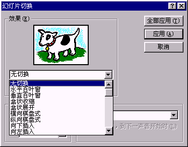 然后单击“幻灯片放映”菜单中的“幻灯片切换”命令。弹出“幻灯片切换”对话框,(如图2)