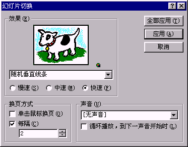 如果还没看清效果,就再点一下上面的图片,效果就又演示一遍。下面的切换速度已经变成可选状态了。选一下“中速”,再选一下“快速”,效果是不一样的。如果不进行设置,缺省状态为“单击鼠标换页”,也就是在幻灯片放映过程中,点一下鼠标,幻灯片就换到下一页,同时显示换页效果;如果在复选框上点一下,取消了“单击鼠标换页”,那在放幻灯片时,点一下鼠标,幻灯片就不会换到下一页。还可以不用任何操作,就换到下一页。,选取换页方式中的间隔,然后在下面的文本框中输入一个时间,我们输入2,(如图5)那么幻灯片放映时,隔2秒钟它就会自动切换到下一页。