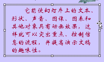 什么是“自定义动画”呢?它能使幻灯片上的文本、形状、声音、图像、图表和其他对象具有动画效果,这样就可以突出重点、控制信息的流程,并提高演示文稿的趣味性。那么如何来操作呢?在幻灯片视图中,选中要添加动画的文本框或者对象,(如图1)