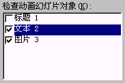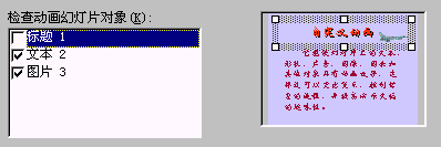 就得到了从中间向左右展开的动画。我们可以预览文本及对象的动画效果,观察它们如何工作,并随时调整,直到满意为止。其它对象也能设置动画,幻灯片里的所有对象都能设置动画。在“检查动画幻灯片对象”列表框中列出了本页幻灯片中所有对象的名称(如图4),处于选中状态的就是已经设置了动画的,刚才这个文本框前已经打了个勾,说明它已有动画了。我们再选中另一个对象,这时右面的图形中就标明了是哪个对象被选中。(如图5)