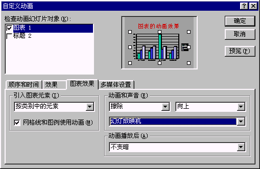然后对图表进行“自定义动画”设置,单击“图表效果”选项卡,在“引入图表元素”下拉列表中,选择“按类别中的元素”,复选框“网线和图例使用动画”是决定图表中的网线和图例是否使用动画。在“动画”下拉列表中列出了播放动画的方式,选择“向上擦除”,然后再选择一种合适的声音,(如图10)