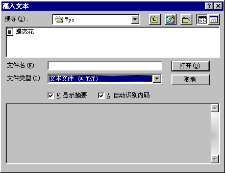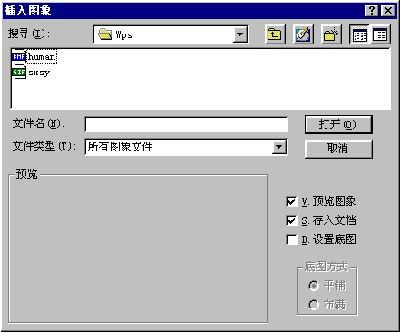 | 下面来看看图像框。WPS 2000中可以直接插入图像,前提是这种图像格式必须是WPS 2000能够识别的。 那么WPS 2000能够识别哪些图像格式呢? PS 2000可以识别的图像格式有九种。我们不用去记是哪九种,点一下“插入图像”这个按钮,会出现一个打开文件的对话框(如上图),点一下“文件类型”后面这个下拉按钮,这里列出的九种图像格式就是WPS 2000可以识别的(如左图)。缺省的文件类型是“所有图像文件”,其实是指列出所有WPS 2000能识别的图像文件。这种情况下我们直接单击文件名,然后点“打开”就可以把该图像插入到文件中插入点光标所在的位置了。点“打开”之前,我们可以在“预览框”里看到图像的显示。如果不想预览图像,就把这个预览图像前面的对勾去掉。 如果“存入文档”这个选项被选中,那么文件存盘时,插入文件的图像将以位图的方式存储在WPS文档中,以后即使原来的图像文件被删除,也不会影响WPS文档中插入的这幅图像。如果取消这个选项,系统只将图像文件的路径和名称存入WPS文档,下次打开文件时,系统到所记录的路径下打开图像并显示在文件中。如果原来的图像文件被移动或删除了,系统将提示找不到文件,而文档中只保留空的图像框和一个示意图。这时我们必须把图像文件拷贝回原来的文件夹里,图像才能正确显示。 |
