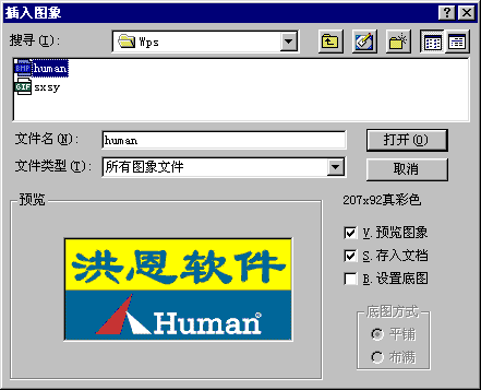 | WPS 2000能读入的图像格式有十种: 1.位图文件(*.bmp)、 2.设备无关位图文件(*.dib)、 3.PC Paintbrush 文件格式(*.pcx)、 4.Targa 文件格式(*.tga)、 5.PNG(Portable Network Graphic)文件格式(*.png)、 6.Graphic Interchange Format 图形交换格式(*.gif)、 7.Joint Photographics Expert Group Format 图形格式(*.jpg)、 8.Tagged Image File Format TIFF 文件格式(*.tif)、 9.Windows 元文件格式(*.wmf)、 10.Encapsulated PostScript 文件格式(*.EPS)。 |