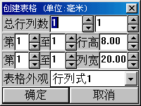 可以从“插入”菜单(如左图)中选择“表格...”,然后选择“创建表格...”,在弹出的创建表格对话框(如右下图)中键入或选择表格的行列数,在“行高”与“列宽”框中键入或选择表格中各行列的行高与列宽,在“表格外观”框中选择表格的整体外观。在对话框中改变设置值时,页面上的表格随之即时更新。