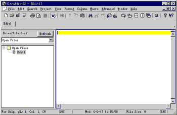 UltraEdit的启动很简单,可以选择要编辑的文件,然后在右键菜单中选择 “UltraEdit-32”即可,使用起来简单、方便。 这就是UltraEdit的主界面,上面是标题栏、菜单和工具栏,下部左侧为驱动器文件列表,方便文件的查看;右侧为文本编辑区,我们打开的文件就显示在这里。