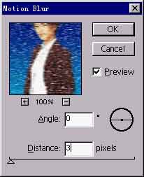 (图9) (图10) 6.选取“Filter”菜单下的“Blur”选项中的“Motion Blur”------(方向虚化滤镜),在弹出的对话框中如图12所示进行设置,由于该层的叠放为Screen模式,所以所有图中只有白色部分的虚化效果才会在背景层的衬托下显现出来,形如暴风雪刮过的效果,最终的效果如前面的预览图所示。