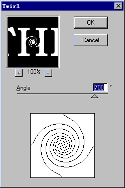 | 如何制作漩涡字? 预览成品:  逐步说明: 1、选择“File”菜单下的“New”命令,新建一个宽(Width)为280 pixels,高(Height)为160 pixels,模式(Mode)为“RGB”的图象文件。 2、单击“Channels”面板下的按钮,新建一个通道“Alpha”。如图1。 3、单击工具栏文字工具,在图象任意地方单击,在弹出地对话框中输入“THE”,并单击“ok”,可以看到在图中出现了文字选区。 4、单击工具栏上的椭圆形选取工具,按住“Shif”键,用鼠标在字母“H”中拉出一个正圆,如图2。  图1 图2 5、单击“Filer”菜单,选择“Distort”子菜单,再选择“Twirl...”虑镜,在打开的对话框中设置旋转角度为“700”,如下图,在预览的小窗口中就能看到效果了,已经将选区内的文字部分旋转,然后点击ok按钮。  6、用相同的方法在图象其他相应的位置选取圆形区域,并使用“Twirl...”虑镜进行旋转,如下图,这个过程有点麻烦,因为需要不断的进行调整。  7、现在开始制作背景效果及文字色彩的渐变。单击“Channels”面板中的“RGB”通道,回到复合颜色通道。 8、选择工具栏中放射型渐层工具 ,在“Radial Gradient Options”面板中设置渐变颜色为浅蓝到深蓝,如左下图。  9、用鼠标在图象中由中心至边缘划一直线,图象就产生了色彩渐变效果,右上图。 10、再次使用“Twirl...”虑镜对图象进行旋转,设置角度为“999”,看到如下的效果图了吗? 11、单击“Select”菜单,选择“Load Select..”命令,将“Alpha 1”通道载入,文字选区出现在图象中。 12、在“Radial Gradient Options”面板中设置渐变颜色为浅黄到金黄进行渐层操作,如图。 13、用鼠标有文字中心至边缘拉一条线,文字就产生了渐变效果。按“Ctrl+D”取消选择。  14、下面我们来对图象进行光照处理。单击“File”菜单,选择“Render”,再选择菜单中的“Light Effects”子菜单,在弹出的对话框中,把“Light type”设为“Spotight”,把“Intensity”设为“28”,把“Focus”设为“64”,把“Ambience”设为“22”。其余的保持不便。完成设置后点击ok即得到预览的图象效果。 上一技巧(如何制作邮票) 下一技巧(如何制作星状放射线效果)  谈谈您的看法 |