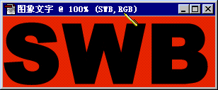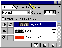 5、按住Alt键,将鼠标放在图象层Layer 1 和SWB文字层之间的实线上,当鼠标变成两个相互叠加的圆圈时,点击鼠标左键,此时你可以看到两层之间的实线下面出现了一条虚线,文字层的的名字中多了一条下划线。猫的图象缩进了文字里,如下图。