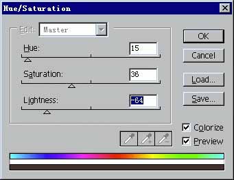 12、单击菜单“Image/Adjust/Hue/Saturation”命令,在对话框中设置如下:(注意:要首先把Colorize选上)