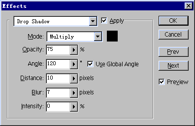 14、单击“Channels”面板的“Layers”标签,切换到“Layers”面板,在“Background”层上单击右键,在弹出的菜单选择“Layer Via Copy”,将选区内的图象复制到“Layer 1”中。 15、在“Layer 1”中单击右键,在弹出的菜单中选择“Effect”,在对话框中的设置如下: