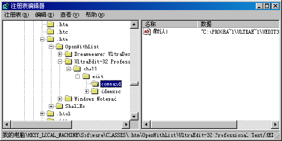 HKEY_LOCAL_MACHINE\Software\CLASSES\.htm\OpenWithList\ HKEY_CLASSES_ROOT\.htm\OpenWithList\这下面的目录里显示的就是我们现在编辑按钮中有的编辑器。仿照别的编辑器的目录结构,新建一系列目录:Dreamweaver\shell\edit\Command\在command目录下,把默认键的兼职改为你要使用编辑器的路径。退出注册表编辑器,再到ie中试一试看。