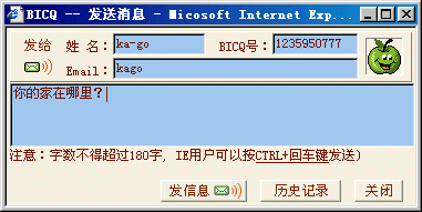 点击好友左侧的小图标(如左图),弹出“发送消息”窗口(图十一),发什么消息了?就发“你的家在哪里?”吧,点“发消息”就OK了。