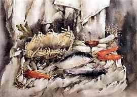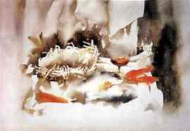整体地处理步褶的结构转折以及疏密关系,局部刻画鱼、胡萝卜等物体用极淡的土黄大笔触地对小箩筐进行罩染。刻画玻璃杯。