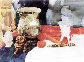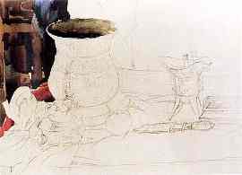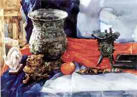 对物体作深入的描绘。 如青铜器物上的图案和色彩的变化的刻画表现,既要注意细节又要保持它的整体感。同时对红布夜要作深一步的描画,作品就完成了。深入的过程中,同时对画面作整体上的调整。