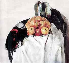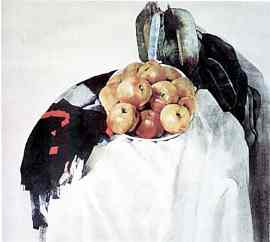 进行调整,白衬布的布纹着强调一下,该加重的加重。水果集中在盘子里,但其前后应从色彩上给于区别。整个画面整体的黑白灰关系明确,构图和色彩都非常稳定。