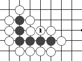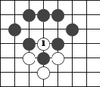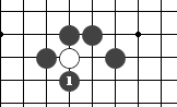 如果在没有气的交叉点上下子的同时能使对方也没有气,这种情况下非但可以下子,而且可以提掉对方的棋子。如下图白子下在1位,虽然旁边没有气,但因为黑棋同时也没有气,因此非但可以在此处下子,而且可以把八个黑子提掉。 二:围棋的技巧