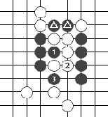 图14的 黑1打吃,当白2长时,黑6即可抱吃白三个子。这样才能解救两个△号黑子。