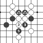 1:利用打吃 图33:白△断,企图吃掉一个黑子,黑应怎么办呢?黑1打吃,白2长,这时黑3赶快连就逃出去了。