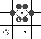 如图4,黑下1位可提白一子,白下△位也提黑1一子,这样吃来吃去的现象在围棋中叫"劫"。围棋规则对此做了规定,当黑1提白一子之后,白不能立即回提,而要隔一步才能回提,反过来,白如提掉黑1一子之后,黑也要隔一步才能回提。劫在围棋中是一种特殊情况,利用打劫是一种复杂的战术。