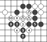用飞的步子来封住对方的子叫"飞封"。 黑要吃住三个白△子,如果如图23所示,黑1封,白2冲,黑3挡,白4打吃,以下至白10,白子逃出去了。 (图23) (3)软封