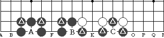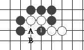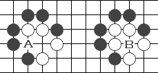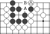 (1)黑△控制了两个角点,A点就是真眼。 (2)黑方眼形上方的一个角点被白占了,这样B是假眼。 (图50)