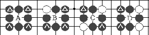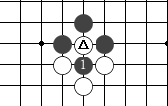 (3),黑方边上的A点,由于黑△子已呈叫吃状态,黑方只能在A点接住,同样可看出,边上这个A点是黑方的一个假眼。