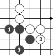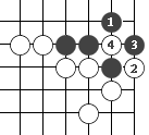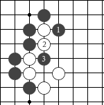 如图7,黑1打吃,白2长,这时黑3双吃,肯定能吃到两个白子。 (图7)