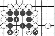 软封 又称枷,俗称"送佛归殿" 。 图24:白△断,黑1软封,白2长,黑3扳,白再长,黑5门吃白子。