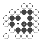图74:黑1是做活黑棋"刀五"眼形的最好点。黑棋看起来眼形很大,但如果轮白方下,仍能点杀死黑棋。白1是点死黑棋的要点。