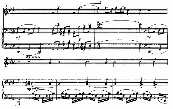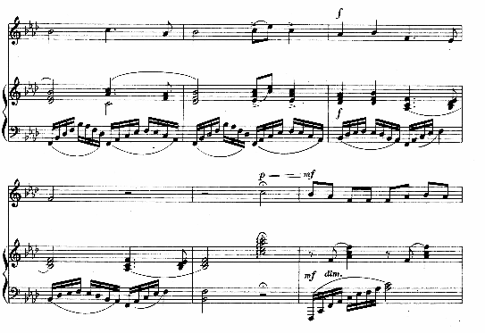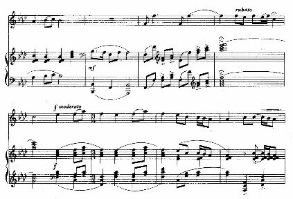 经过重复、对比、变化、发展后,把音乐逐渐推向高潮。高潮的部分往往是在加快速度、展开音域和 加强音色对比的情况下形成的。一些加强曲调力度的双音,也常常用在这些地方。这一部分常常要占全曲一半以上的分量,是构成琴曲的主要部分。