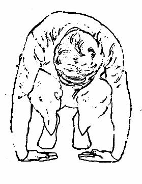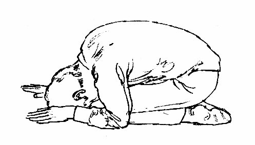 双腿弯曲在躯干的下面,臀部落在双脚后跟上,小臂和双肘挨着双膝,额头放在地面上。这种姿势,身体像准备弹起的动作。双肩向前下部伸展,背部拱起,头朝下,脖梗伸直,重心前移,小臂和小腿不要从地面上抬起。