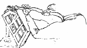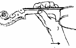 把弓根放在一个谱架上,如图11,用左手扶住弓尖,右手轻轻地放在弓根。然后右手自然变成舒服地姿势。应注意地是:演奏者的肩膀和肩胛骨在下弓动作中应该跟随手和手指运弓,在上弓动作中,则应给运弓的手留出余地。