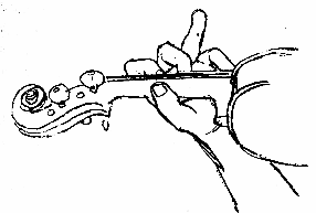 c:持琴动作练习 练习一:如图16 把手指放在指板上方,不要挨上琴弦来持琴。接着,来回移动拇指指骨上端,保持手臂、手腕、左手和拇指下面部分没有动作,但要放松,小提琴伴随拇指来回移动。 图16
