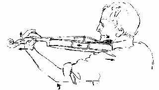 弦上。头朝后缩,不再需要支撑琴而轻轻地放在腮托沙锅内,只是刚好接触腮托以防止小提琴滑离开锁骨。接着把小提琴举起,和地面呈平行的姿势(略高些),把头部临时从腮托上抬起,调整头部和小提琴的新角度,并重新放回腮托。肩部应保持自如下垂,在肩部和小提琴之间应留有。最大限度的空间。