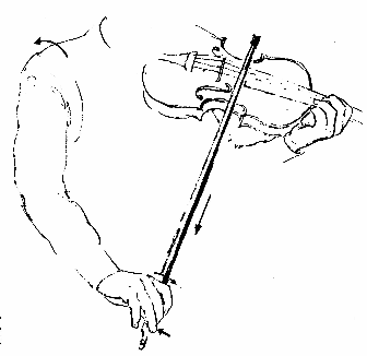 右手大臂拉弓带动运弓;这部分动作能够单独演奏一种短音符的sf;也可以用在弓子的任何部位或其中很小部分,甚至用在一个全弓的快速动作中,无论强音或弱音。