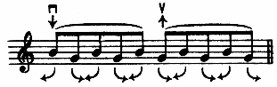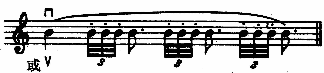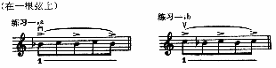 用一弓拉,先下弓后上弓,连续拉一个持续音符,接着一次用力拉三个快速音符为一组。持续音符应该保持足够的长度,使右臂在用力后彻底放松,声音要保持不断。