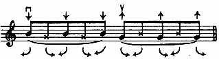 练习在两根弦上的起伏动作,五个音一弓。音符上面的箭头指的是手指关节的高度,音符下面的弯曲箭头指的是拇指的姿势。在下弓动作中,手指关节趋向扁平的姿势,在上弓动作中,手指关节趋向