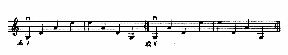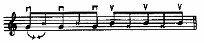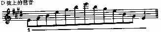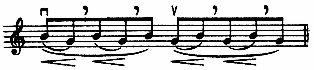 我们把弓子拉得比起弓慢些,四个音符跳弓后,用小指压制力结合一种相反方向的突然动作把弓抬起离开弦,然后 控制住弓子。回拉出如图音型。 图39 L:击跳弓