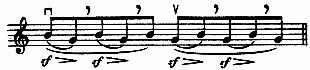 从两个音一组连弓弱奏开始 ,在较低的音上响亮地突然结束。上弓时,从低音弦再次弱开始,在高音弦突然停止运弓动作,每次做一个由弱到强的渐强。