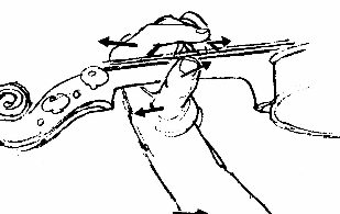 能僵直起来,而是顺其自然--略有弯曲,使拇指处于能伸直,能弯曲的状态。拇指的位置 与状态是握弓的关键,而握弓的好与坏直接影响运弓的质量,也即发音的质量。拇指的正确