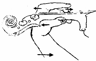 e:水平动作 如图22 用一个手指大约在指板的中间段落按下一根弦,指关节呈平常抬高的姿势,手指分开。保持手指在一个地方支撑住,手腕向外凸起并超出通常的直线姿势,以使指关节向后拖。伴随着肘部向右摆动应该结合指关节微向上伸的动作,而且肩部应背离指关节向相反方向