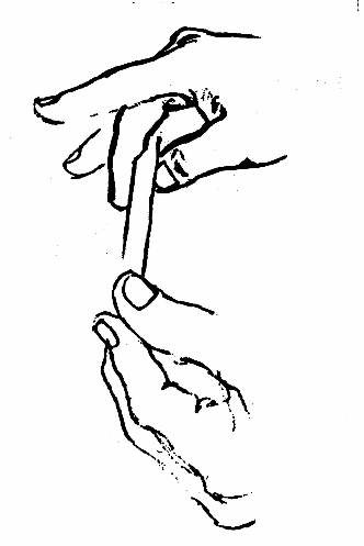 b:拇指练习 有右手食指代替小提琴,把它放在左手拇指的指肚上,有点向左面推拇指指骨上端,直到拇指相当垂直为止。
