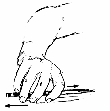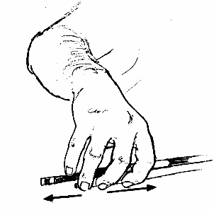 (2)右手的准备练习: A:演奏姿势中弓杆的平衡 用左手一点一点地向左移动手指中地木棍,经常放开左手,其它手指要始终保持松弛。