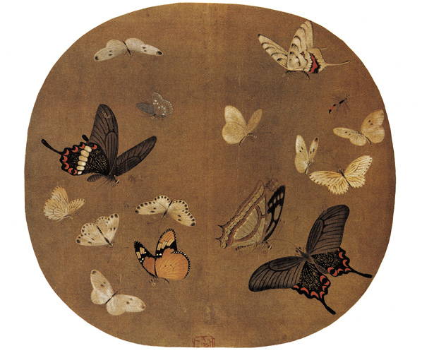 此图原载《四朝选藻册》(见《石渠宝笈续编》)。签题李安忠作。李安忠,居宣和(1119—1125)画院,历官成忠郎。绍兴间复职画院,赐金带。工画花鸟走兽,尤工捉勒,山水平平。此幅状各色蛱蝶,翩翩飞舞于空中,虽不见花,却似嗅得出晴春的百花香味。